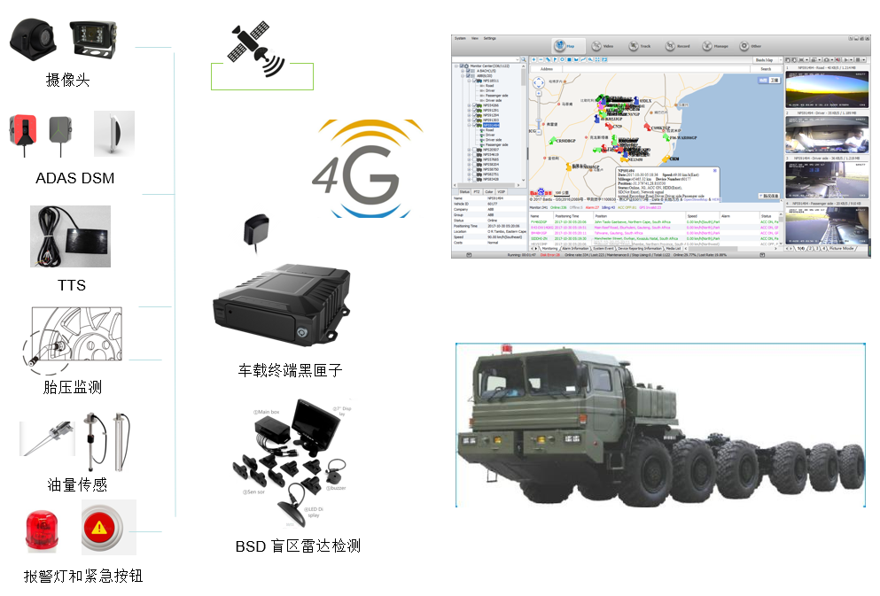 通过在车量上安装4G无线视频智能车载终端套件,实现车辆高精度定位、实时音视频调度、车辆实时油量采集、车胎胎压检测、盲区雷达检测和预警,通过4G传输到后端的数据监控云平台。