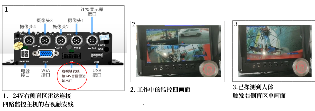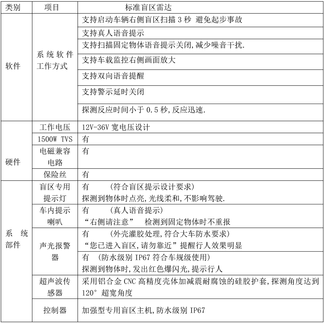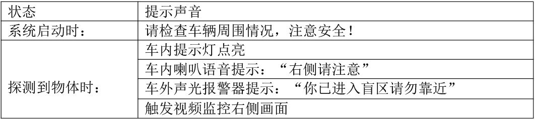 在车辆右侧安装盲区雷达声光预警系统,车辆在右转弯时起到预警提醒作用。车外声光报警器警示行人“车辆请远离,车内声音及提示灯警示驾驶员右侧有障碍物请“注意安全驾驶”。