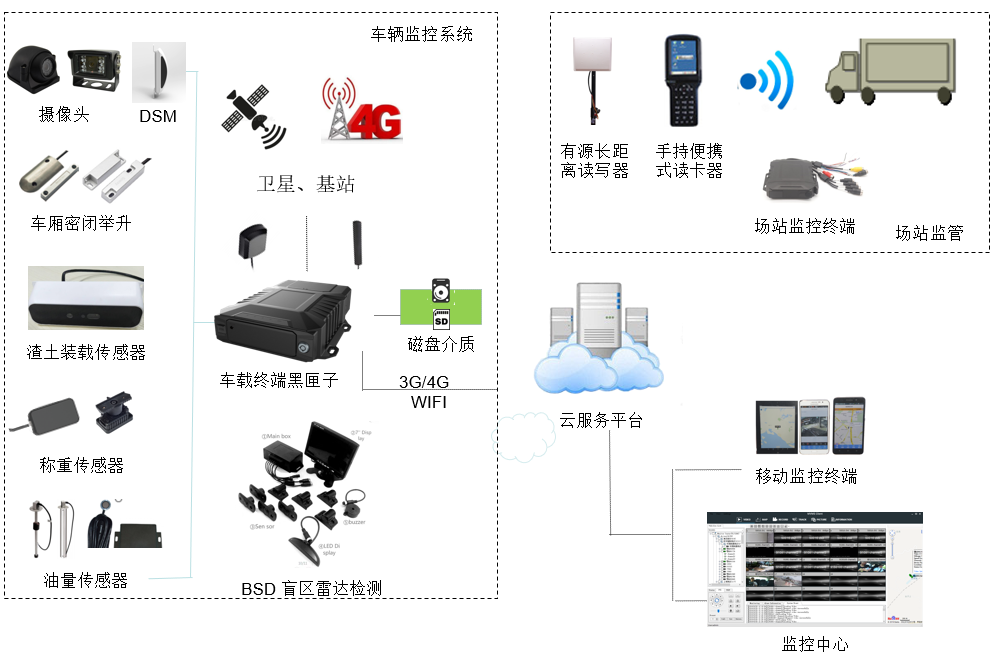 通过在渣土车上安装4G无线视频智能车载终端套件,实现车辆高精度定位、实时音视频调度、车厢密闭检测、车厢举升检测、车辆实时油量采集、RFID电子标签、盲区雷达检测和预警,整合后端的数据监控云平台从而实现城市智慧渣土车的安监运营管理。