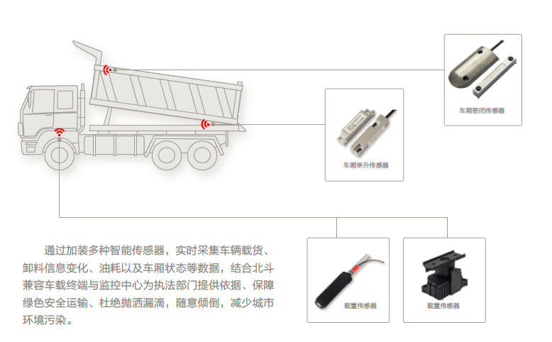 箱体密闭装载监测: 在渣土车上安装箱体装载检测传感器,可实时了解车厢盖的密闭状态以及空载、装载量数据,一旦异常立刻报警,可预防渣土运输过程中的尘土飞扬;