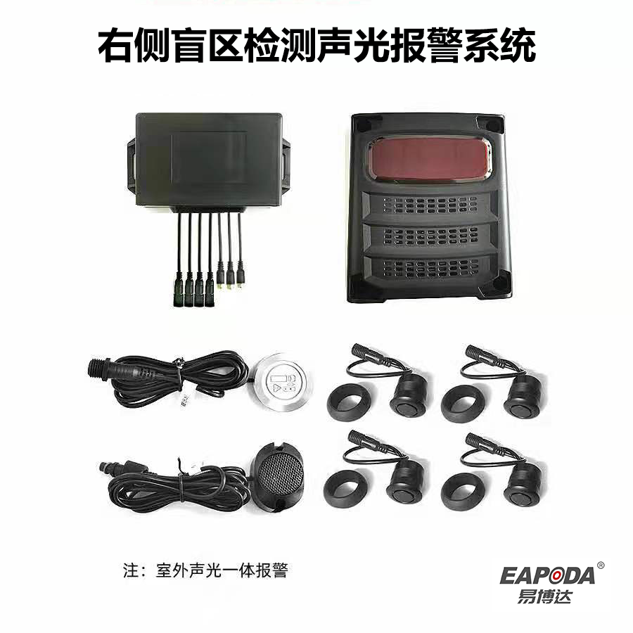 雷达盲区检测系统: 在车的右侧可安装盲区雷达声光报警一体机,可实现车辆盲区检测预警和行人预警提醒,降低车辆行驶的交通事故;
